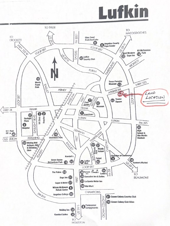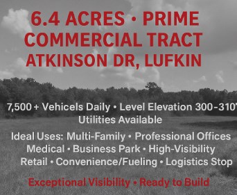 Outstanding development opportunity where city convenience meets country charm on 6.4 acres along one of Lufkin's busiest corridors, with over 7,500 vehicles passing daily. The property sits at a level elevation of 300–310 feet above sea level, well-positioned for immediate development. Zoned commercial, it is ideal for residential or multi-family housing, professional offices, a business park, medical facility, or high-visibility retail such as a convenience store, fueling station, or logistics stop. Utilities (water, sewer, and electricity) are available. With light tree coverage and mostly open pastureland, this tract combines a rural feel with easy access to all city amenities. Competitively priced and held in the same family for generations, it offers exceptional visibility, location, and versatility for investors and developers.