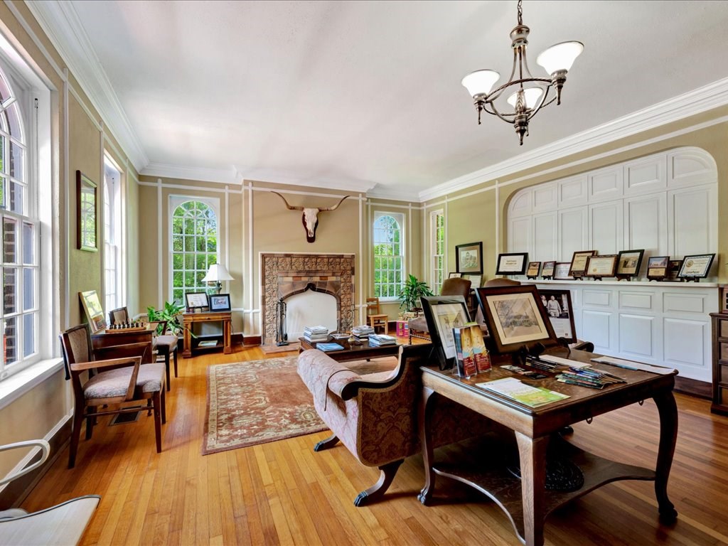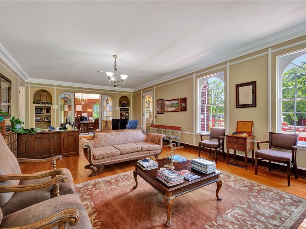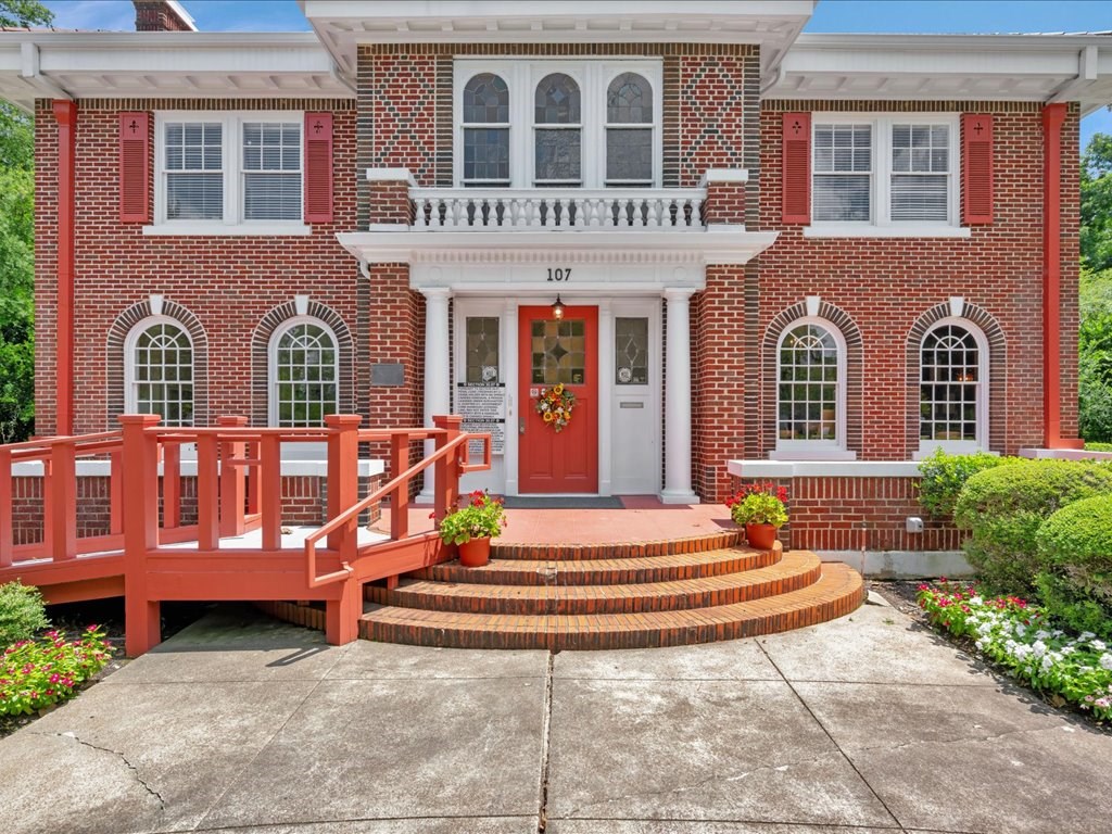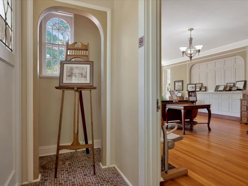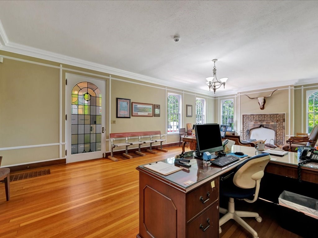 Beautiful Historic Property Sitting on Landscaped 1.31 Acre Corner Lot! This stunning two-story historic building/house offers timeless character. It is currently serving as a professional office but was a residence at one time and could be converted back to one with some changes. Features original architectural details, soaring ceilings, working fireplace, gorgeous stained-glass doors and windows. A separate Carriage house adds a two-car garage along with a bedroom, bath, office space which is ideal for guests or a rental. Window unit in Carriage House. The expansive lot has mature shade trees with plenty of room for entertaining. This property offers endless possibilities and is a delight to view!