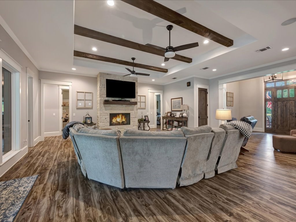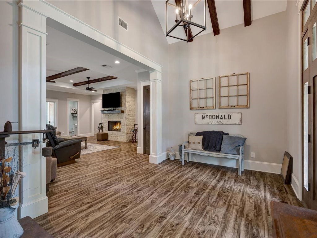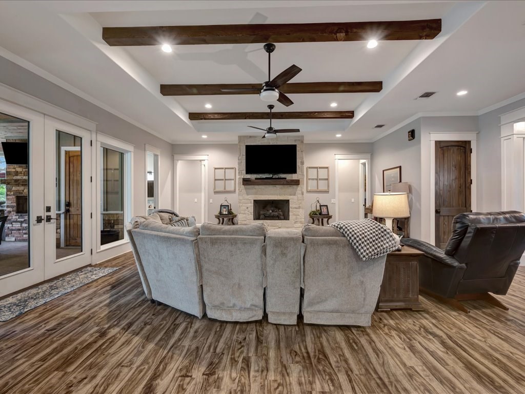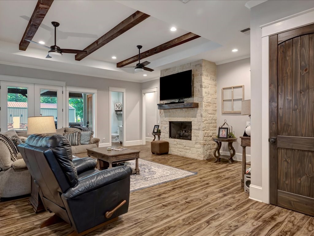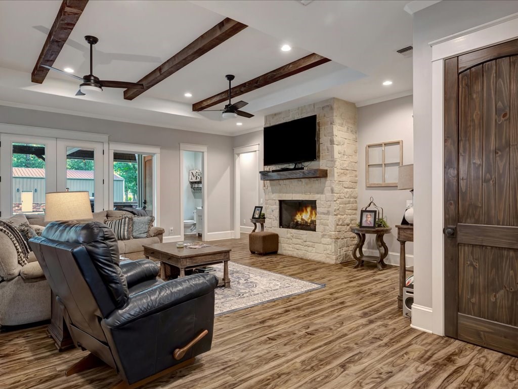 Beautiful custom-built 4-bedroom, 3.5-bathroom home with an office, situated on 4 acres in Lufkin, Texas. This property features an open-concept design with a split floor plan and a spacious living area, ideal for family gatherings and entertaining. Enjoy the covered back patio with a full outdoor kitchen overlooking the sparkling pool – perfect for relaxing summer days. Additional highlights include an insulated shop and a mother-in-law suite complete with a full bathroom. Experience peaceful country living with plenty of space and privacy, all while being conveniently close to everything Lufkin has to offer.