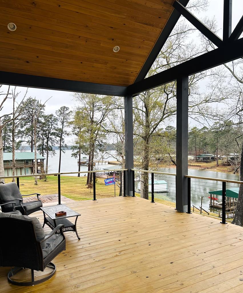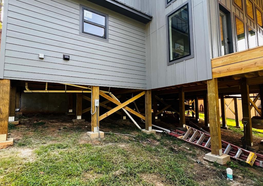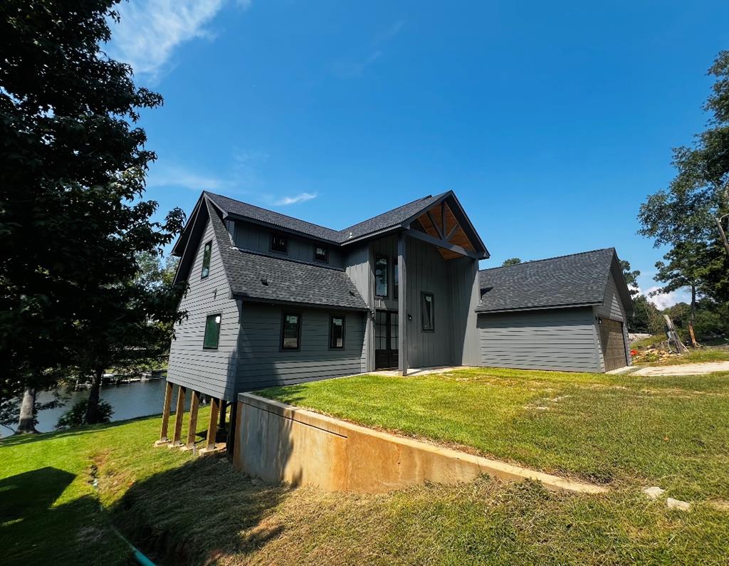 New construction, MOSTLY FURNISHED 2600 sf luxurious lake front home w/grand entrance into 18' ceilings leading to open concept living, dining, kitchen area that includes white limestone fireplace, magnificent 13' island covered w/granite, leather-textured countertops, custom cabinets; a walk-in pantry w/electrical outlets for appliances, water resistant wood floors, 3 bedrooms of which two would support two king size beds OR several bunk beds; 2.5 baths; which master bath exhibits free standing tub & open shower; all rooms have beautiful waterfront views. This house,was built for Hercules himself, Sits on solid pillars attached to concrete columns buried 3' into the ground (per Seller), the large covered porch is wrapped in cedar and there is an unbelievable concrete wall of armor surrounding the front of the home for additional protection, along w/french drains.This magical dream home has an integrated fire alarm, aerobic system 22x35attached garage, Dual a/c 3 ton & 4 ton units.