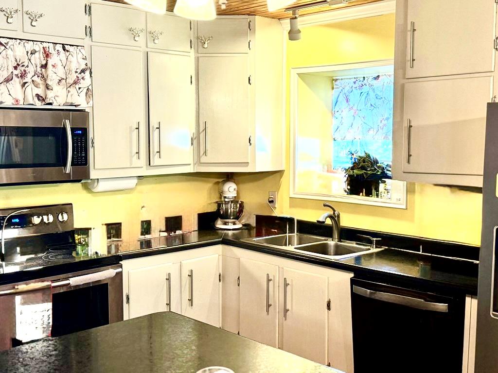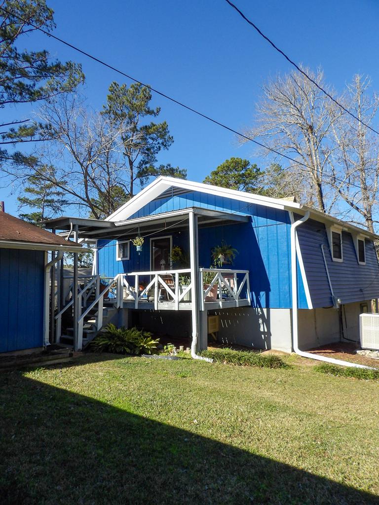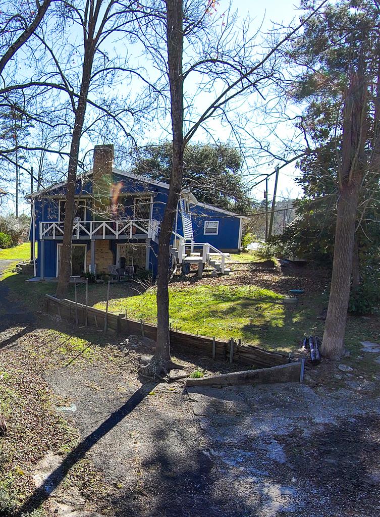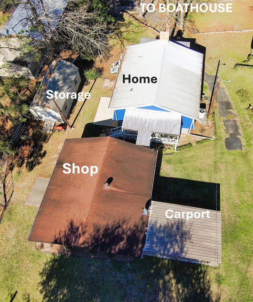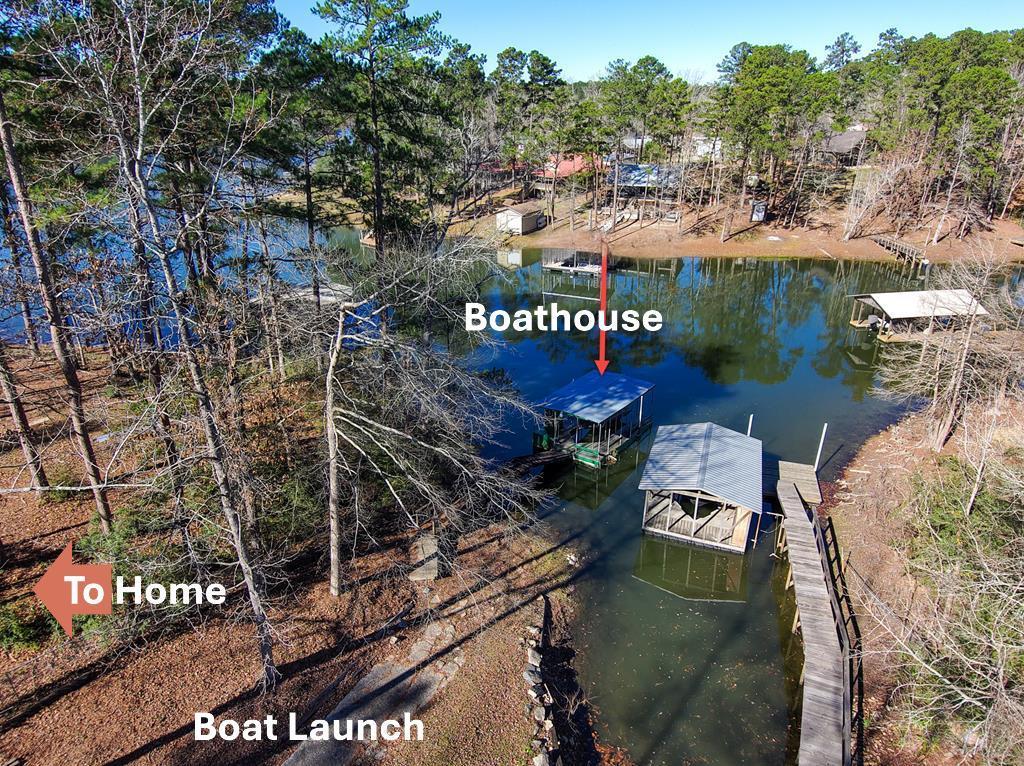 WATERFRONT! Tucked within a peaceful cove, this home is made for entertaining and easy lake living. The entry level—located upstairs—features the primary bedroom and bathroom along with an open kitchen and living area. Don't forget to look up and admire the ceilings; this space can easily be styled warm and cozy or light and modern to suit your personal taste. Step onto the porch and enjoy your morning coffee while taking in the water views. Downstairs offers a large, open area with a wood-burning fireplace and a full bathroom—an ideal setup for a game room, second living space, or guest suite. Guests will love having their own porch overlooking the water as well. The property shares a private boat ramp and fence with the neighboring home, adding convenience for lake access. A generous detached garage provides excellent parking or workshop potential, and an additional storage building offers even more flexibility. This inviting waterfront retreat is ready for your vision and enjoyment.