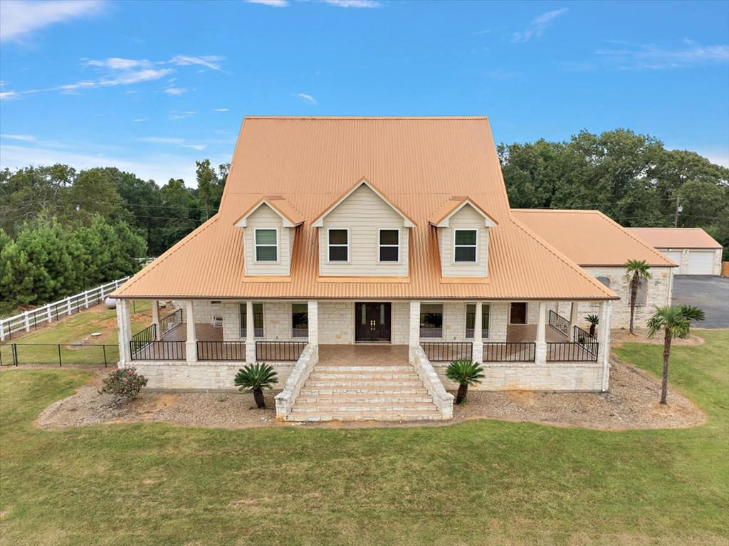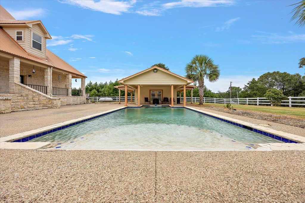 NEW LOWER PRICE This stunning three-story custom home is set on 19.5 wooded acres, offering a serene retreat among the pines. The home boasts impressive features, including custom cabinetry, stainless steel appliances, tile flooring, granite countertops, arched doorways and windows, soaring ceilings, and a spacious primary suite with a sitting area, luxurious bathroom, and large walk-in closet on the first floor. The 2nd floor features three generously sized bedrooms, two beautifully designed bathrooms with custom tile work, a cozy nook overlooking the first floor, and hidden storage spaces. The 3rd floor includes a fantastic media room and a half bath. Outside, enjoy a gorgeous pool with a built-in table, benches, and beach entry, along with a pool house ideal as a guest or in-law suite, complete with a bedroom and bathroom. External features include an Austin stone exterior, copper-colored metal roof, three-car garage, 4,000 sq ft metal building, and an electric entry gate