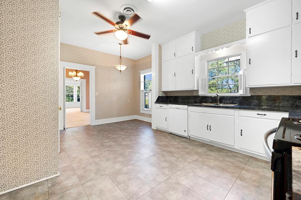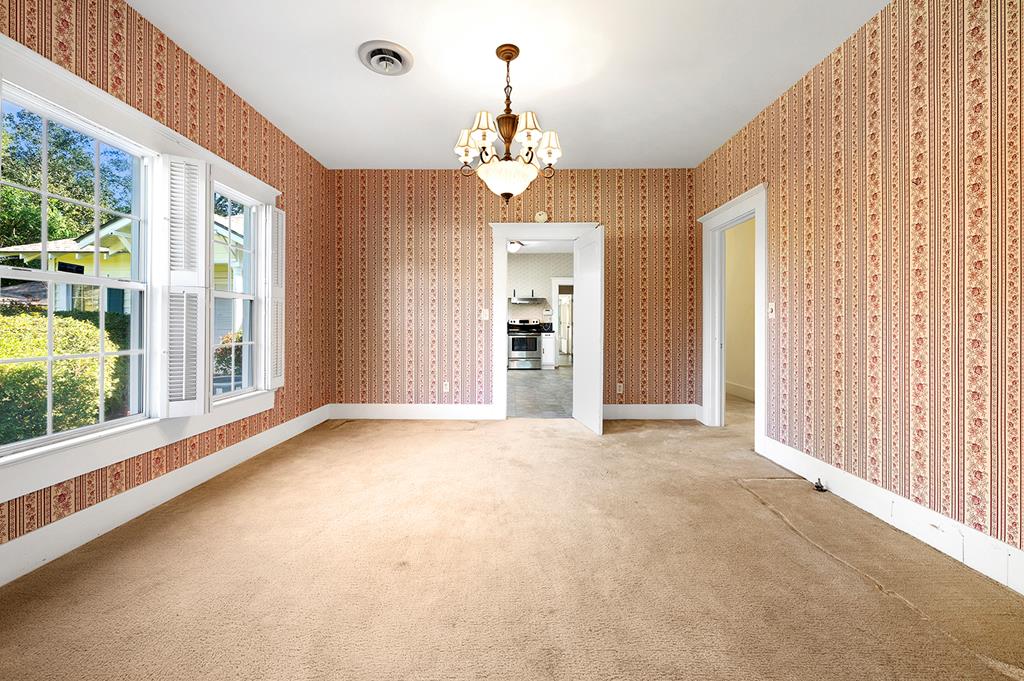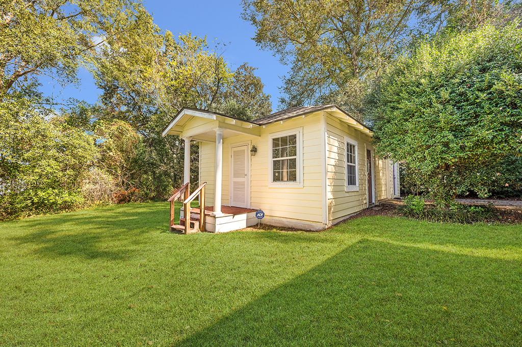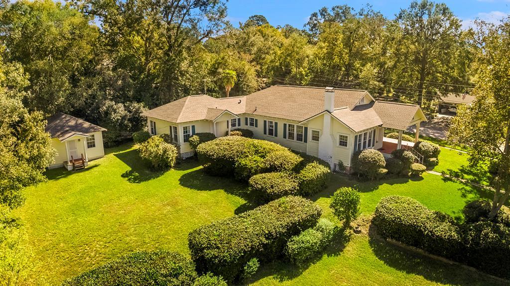 Step back in time with this charming 1940's home offering over 3,000 sq. ft. of character and comfort. Nestled on a half-acre corner lot shaded by mature trees, this 4-bedroom, 3-bath residence features 9' ceilings, a formal living and dining room, and multiple sitting areas perfect for entertaining. Built-ins throughout the home provide abundant storage, while a cozy sunroom and side porch invite peaceful relaxation. A unique side-yard layout offers private access to two bedrooms and a serene sitting area. The detached garage/carriage house includes a large storage room and a private yard surrounded by blooming azaleas. Recent updates include a new roof (5 yrs), windows, alarm system and HVAC blending classic charm with modern comfort. NOTE: The original hardwood flooring is under all of the carpeted areas with the exception of the wing off the utility room.
