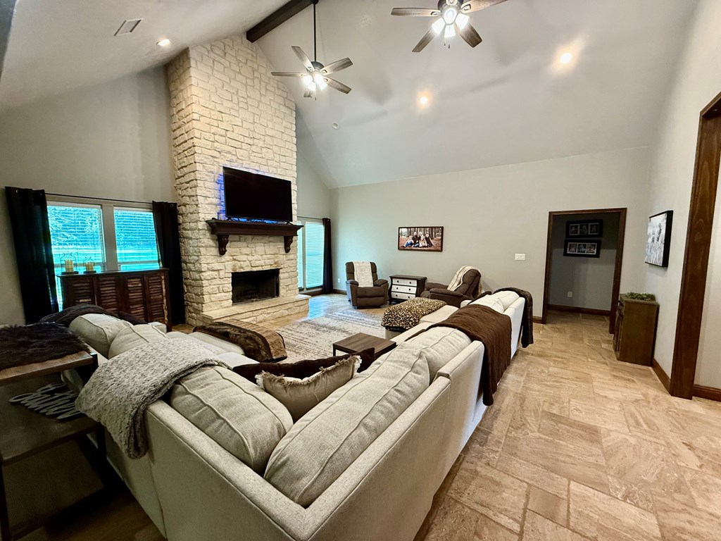 Nestled in the pines and unseen from the road, this custom brick-and-stone residence balances everyday function with quiet seclusion on 26+ acres. Inside, an open concept invites gathering—granite counters, stainless appliances, and an oversized island center the kitchen, while a hidden walk-in pantry keeps the look clean. A wood-burning fireplace adds glow to the main living area, complemented by secondary living and dining spaces for effortless entertaining. The primary suite feels like a retreat with dual closets and a spa-inspired bath featuring a bench-seat shower, jetted tub, dedicated vanity, and abundant cabinetry. On the opposite wing, a Jack-and-Jill bath smartly connects two bedrooms. With an attached two-car garage, storage throughout, and a substantial on-slab shop for vehicles, equipment, or hobbies, this homestead is ready for whatever comes next—enjoy it mostly wooded or shape it to your vision.