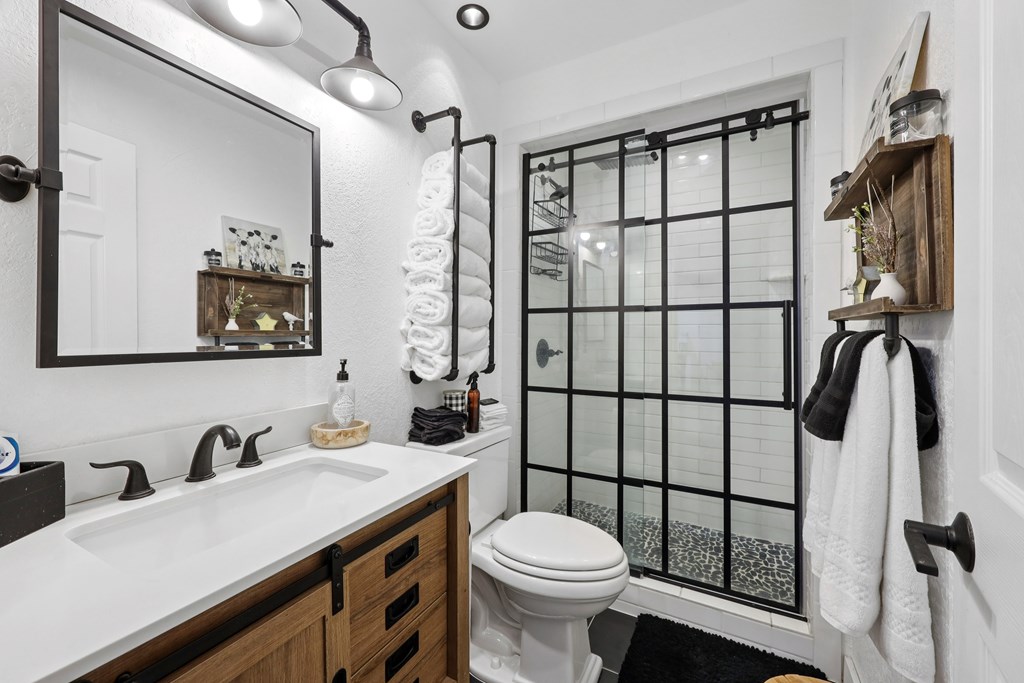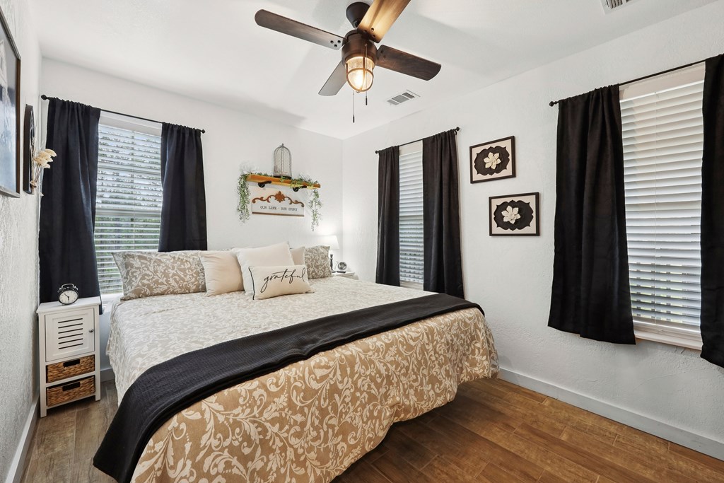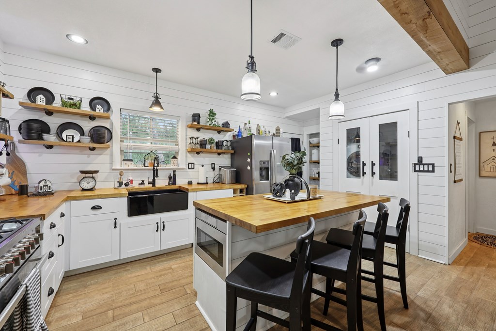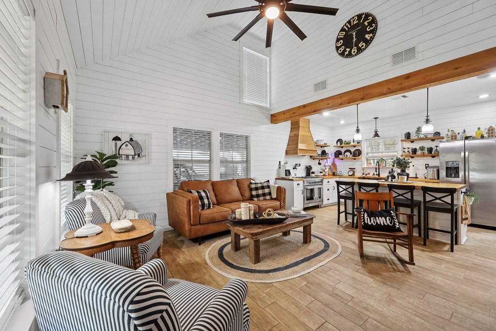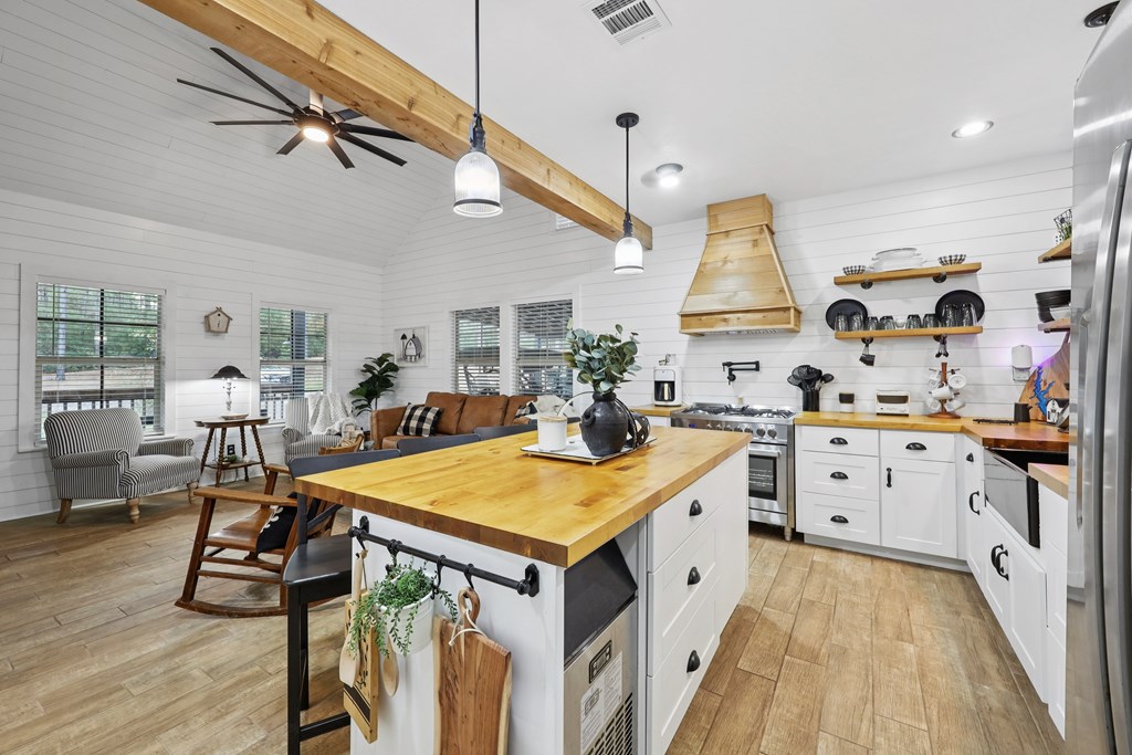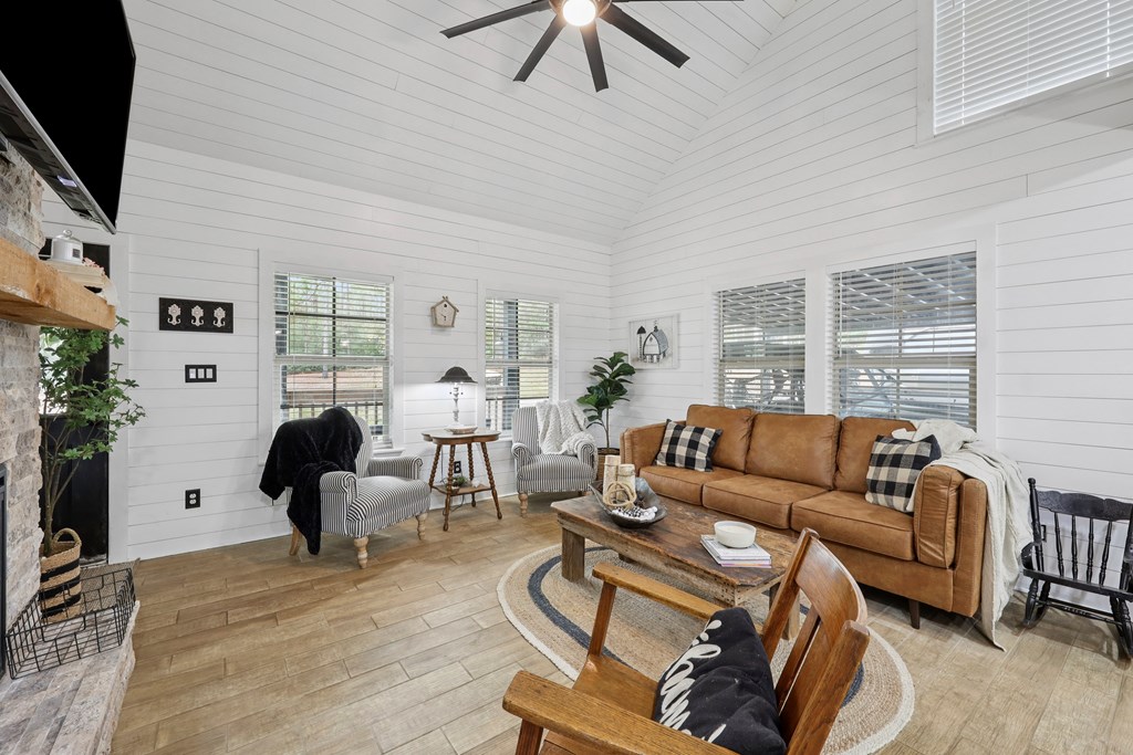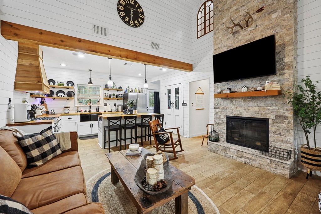 Experience modern farmhouse living at its finest in this beautifully remodeled home, ideally situated on two spacious lots totaling .42 acres in Rayburn Country at Lake Sam Rayburn. With 3 bedrooms—including a versatile third loft bedroom—and 1.5 bathrooms, this 960-square-foot residence is perfect for both permanent and part-time living. Step inside to discover high ceilings and an open concept living space adorned with stylish shiplap walls. The stone electric fireplace creates a cozy centerpiece, while the gourmet kitchen features a professional-grade propane range, making meal preparation a delight. Enjoy the privacy and tranquility of your surroundings while being just moments from Rayburn Resort amenities and the breathtaking Lake Sam Rayburn. Whether you're cozying up by the fireplace or entertaining guests in the bright living area, this modern farmhouse offers the ideal blend of comfort, function, and style. Don't miss your chance to make this gorgeous property your home!
