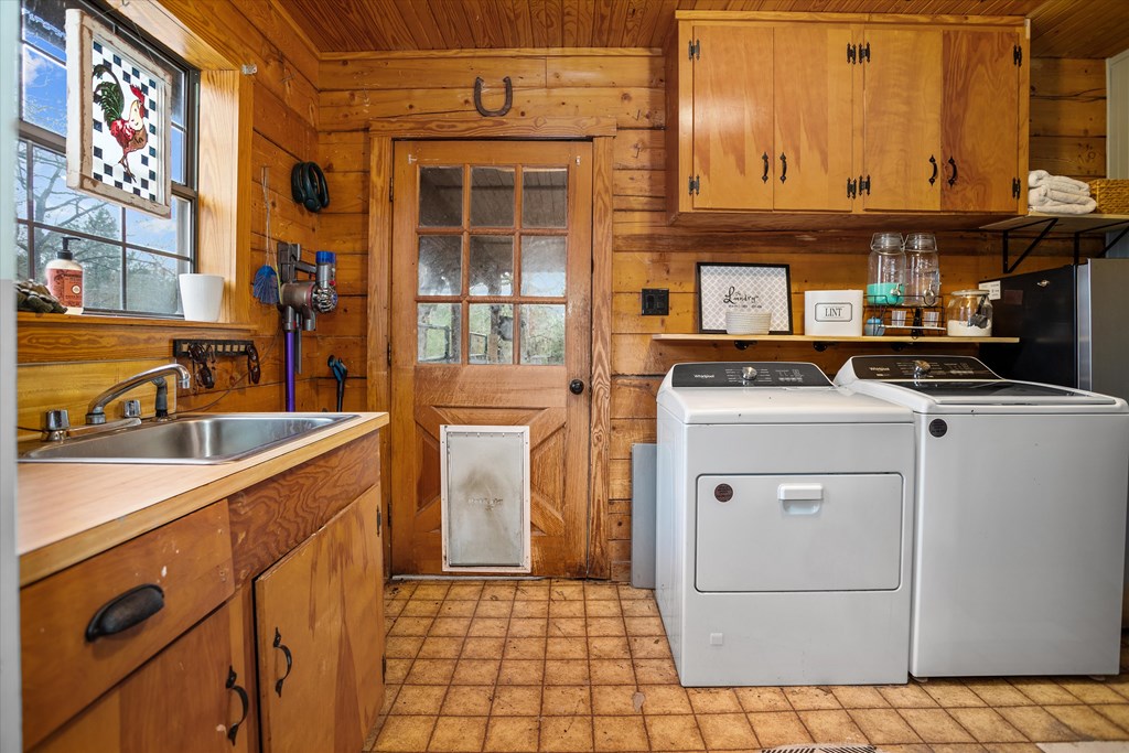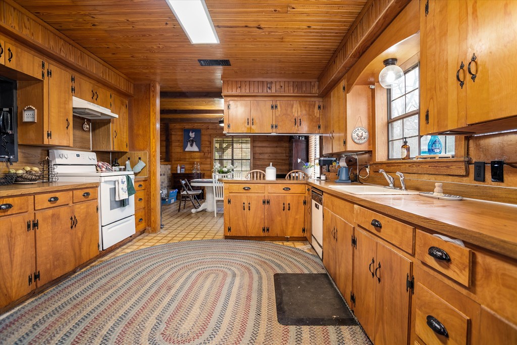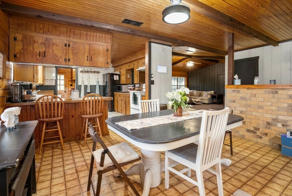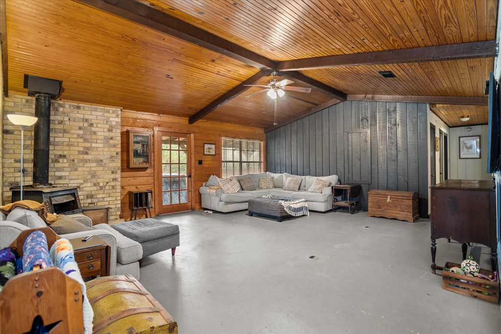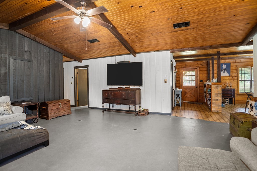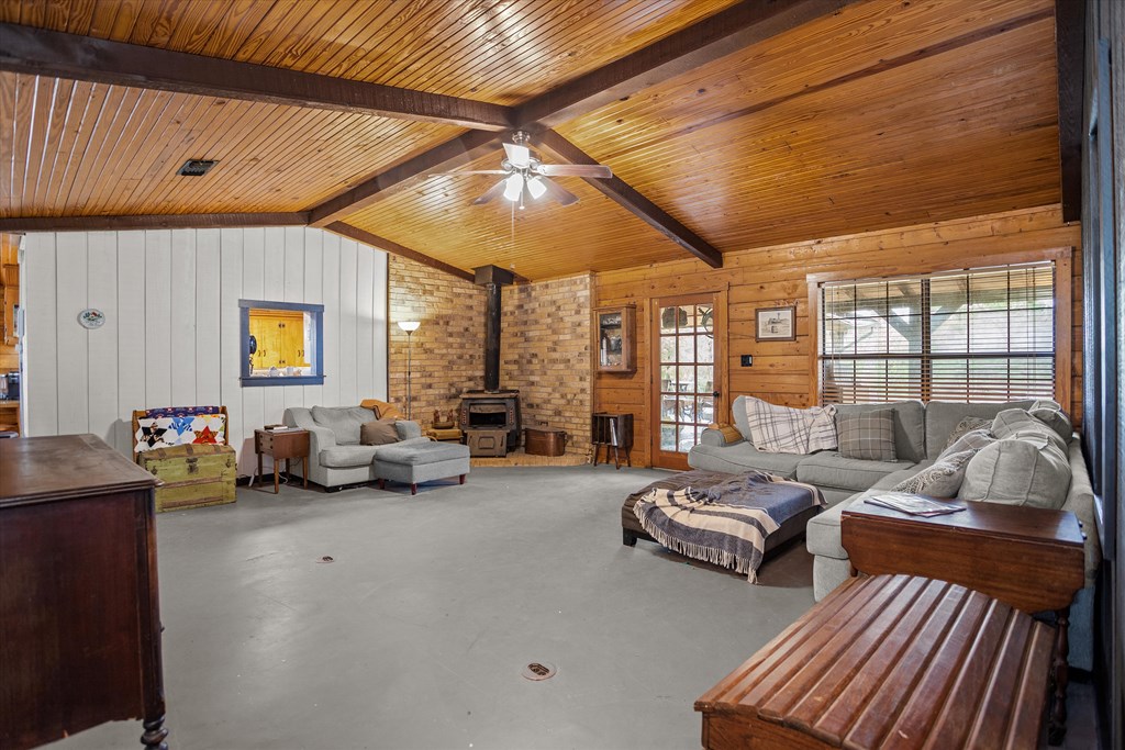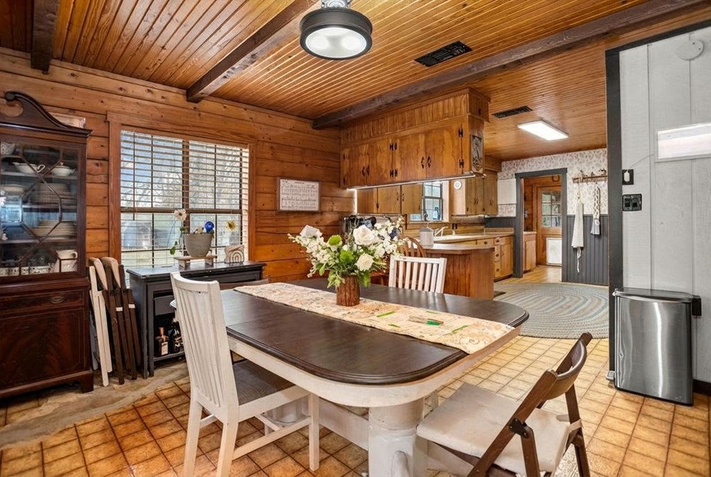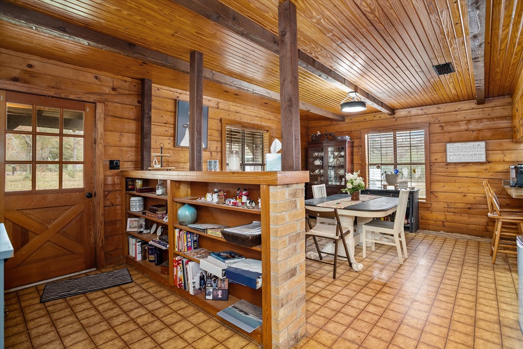 Nestled in the quiet countryside of Huntington, this 1980s Satterwhite log home offers the peaceful charm of true homestead living. The home is filled with rustic character, highlighted by a cozy wood-burning stove perfect for chilly East Texas winters. Fresh paint throughout various areas adds warmth while preserving the classic log cabin feel. The kitchen is full of personality with charming details and nostalgic chicken-themed wallpaper. A large, covered patio overlooks the surrounding acreage, creating the perfect space to relax and enjoy the serene East Texas setting. Situated on over 10 acres, the property includes multiple outbuildings ideal for 4-H projects, livestock, or storage. A peaceful half-acre pond is tucked among mature pines and hardwoods, offering privacy and natural beauty. With a little TLC, this property holds incredible potential. Affordable and full of opportunity - a country living dream! Foundation repairs have been completed by Solid Foundation Experts.