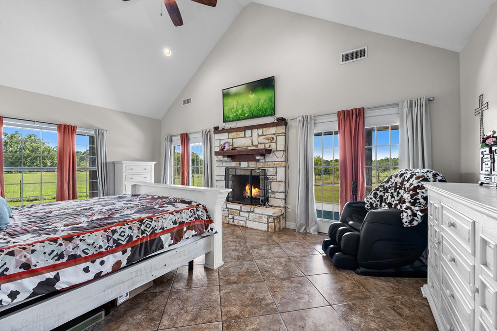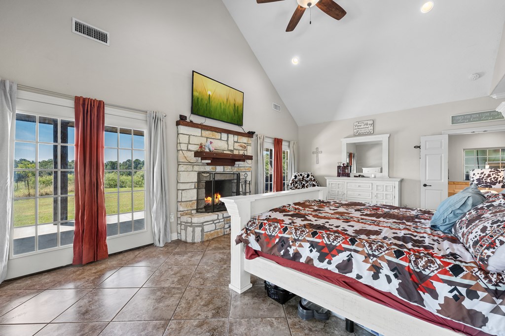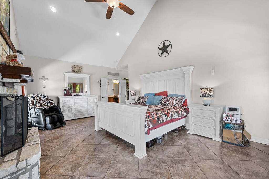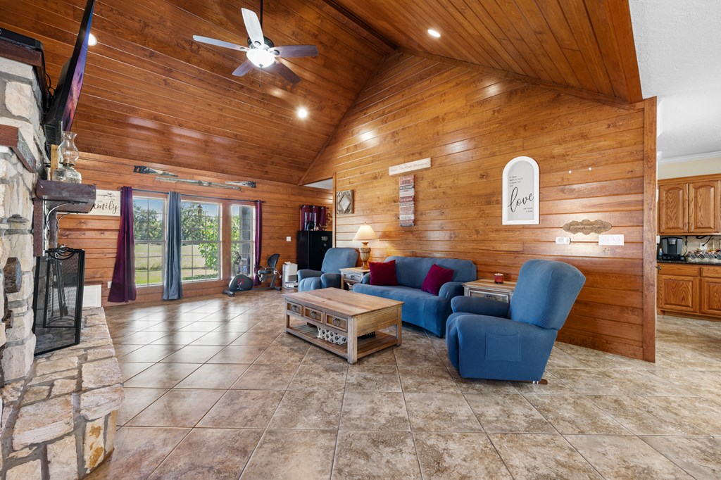 Set on 11 acres of open and wooded land, this 3-story ranch-style home features an expansive wrap-around porch, vaulted cathedral ceiling, and stone fireplace in the living area. The kitchen offers abundant cabinet storage, a walk-in pantry, and a large dining area with breakfast bar seating. The primary suite includes an ensuite bath and fireplace. Two laundry areas—upstairs and downstairs—for convenience. Tile floors on the main level and new 25-year Stainmaster carpet upstairs. Outdoor bar, above-ground salt-water pool, and hot tub for relaxation. Large metal workshop with power, 3-space carport, and multiple electric/water hookups for RVs or mobile homes. Wooded back area with deer feeders provides space for hunting and livestock.