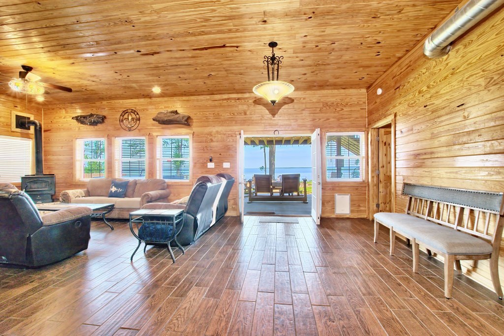 TX sized Barndo on 2.763 acres overlooking Toledo Bend Lake! If you're looking to RETIRE or INVEST, this gorgeous 3800 sq.ft. lake house is priced to sell. The home features 5B/3B plus 4 built-in twin-XL bunk beds. Spacious kitchen/dining/living area opens onto a lg covered back patio. Kitchen features beautiful quartz countertops, custom cabinets, large kitchen island, huge walk-in pantry and 2 full size ovens. Two bedroms, 2 full baths and laundry room are on 1st floor. Upstairs are 3 bedrooms, full bathroom, built-in bunk beds, lg entertainment area, 3rd floor bonus loft and lg covered deck accessed through double French doors. Outside you will enjoy panoramic lake views, picturesque skies, and eagles soaring by. The house also features a large firepit area, extra sitting deck, and large pond. The large double wide, double deep garage has attached carport and unfinished 2nd floor that can easily be transformed into additional 768 sq.ft. of living space. Furniture negotiable.