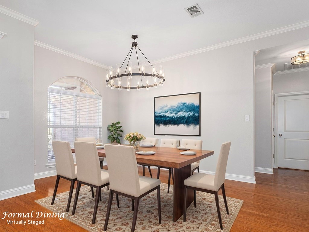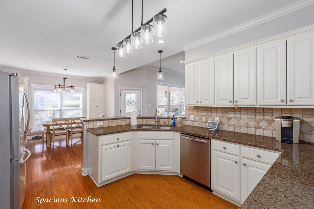 Located in the established and restricted Spring Creek neighborhood, this beautifully updated 4 Bedroom, 2 Bath home is truly like no other with a gorgeous water view and access to 2 ponds! This home is sure to impress from the moment you step inside, featuring all hardwood floors, a spacious open concept design, enhanced by tall ceilings, custom crown molding in every room, and a stunning white stone gas fireplace. There are tons of large windows with new custom blinds that provide a great view of the water while also filling the home with natural light. The kitchen includes stainless steel appliances, granite countertops, breakfast bar, and tons of cabinet & counter space. There is also a huge formal dining room and a breakfast room! The split floor plan provides privacy, with a spacious primary suite featuring boxed ceilings, an ensuite bath, and three walk-in closets! To top it all off, this home includes a full house Generator for full peace of mind during power outages!