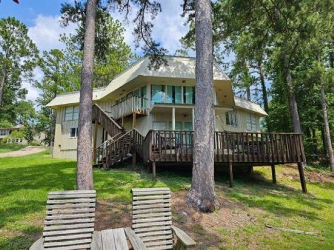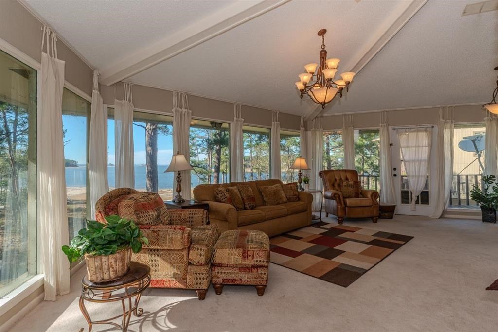 What a lake house! What a lake view looking out towards The Island! Waterfront home with large, direct views of Lake Sam Rayburn. Large windows in every room allow for natural light to flow into home along with the most amazing lake views. On main floor you will find an open floor plan with living, dining room and kitchen. Two bedrooms, (Primary and guest) and 2 full bathrooms. Downstairs there is another 2 bedrooms & 1 bathroom. One large room downstairs can be the 4th bedroom OR a large game room. You will love sitting on the deck, relaxing and watching the sunsets. The home is on the open lake, not just a cove, so the views are great! Spacious enough for a large gathering, (beds for 10 people, plus 2 more on sleeper sofa) hosting parties, or just space for rest and relaxation. Call today for a tour if you are ready for fishing, boating, or swimming in the lake or community pool.