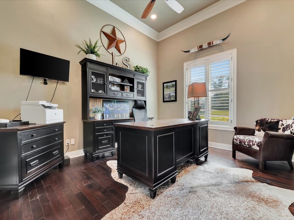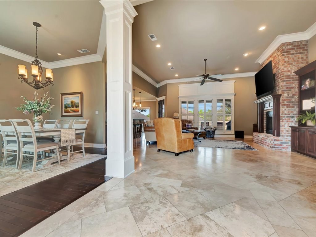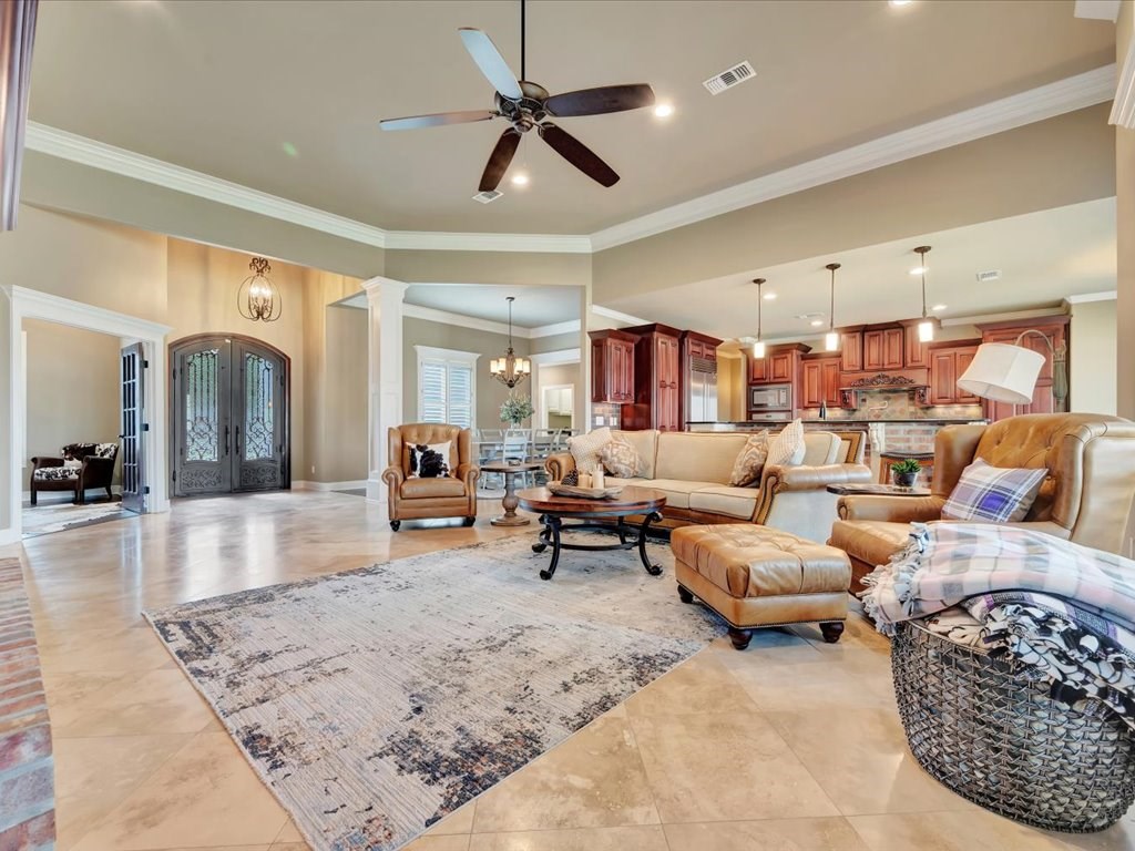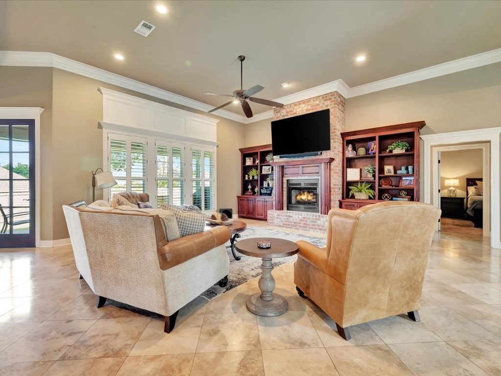 Welcome to this stunning New Orleans style 2012-built home featuring an elegant blend of stucco and brick. Meticulously maintained, this four-bedroom, three-bathroom residence boasts an inviting open concept design. As you enter, you are greeted by a spacious gathering area with practical tile floors and soaring ceilings, highlighted by picture windows that fill the space with natural light and offer serene views of the fully fenced backyard. The kitchen is equipped with recently replaced and elevated appliances and seamlessly flows into the living area complete with a cozy fireplace and built-ins. A dedicated front office provides a quiet retreat for work or study. With two bedrooms and a full bathroom thoughtfully positioned on one side of the home, the luxurious primary suite offers privacy on the opposite side of the home, while an additional fourth bedroom and full bathroom await upstairs. Whole home generator included. Roof replaced in 2024. HVAC system replaced in 2025.