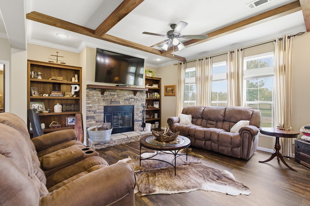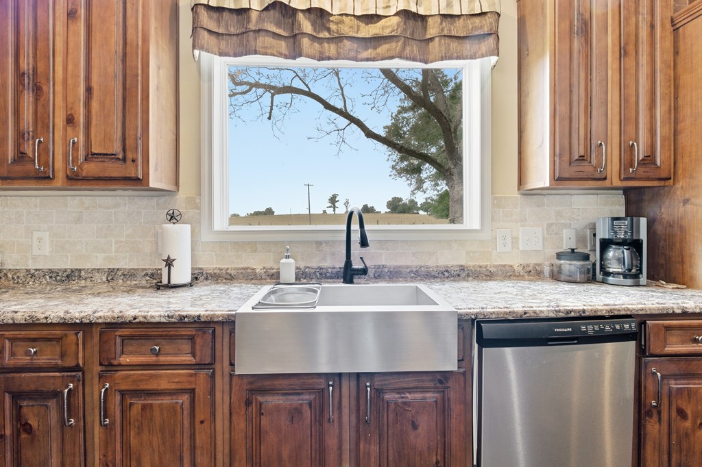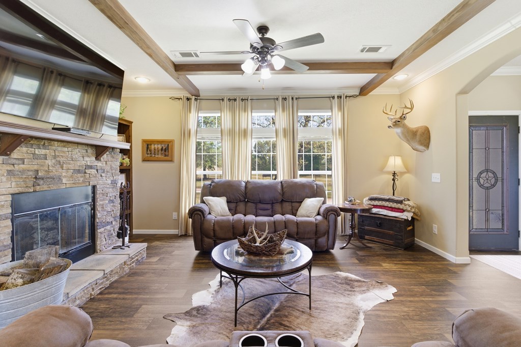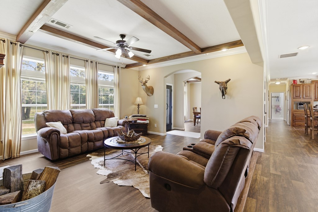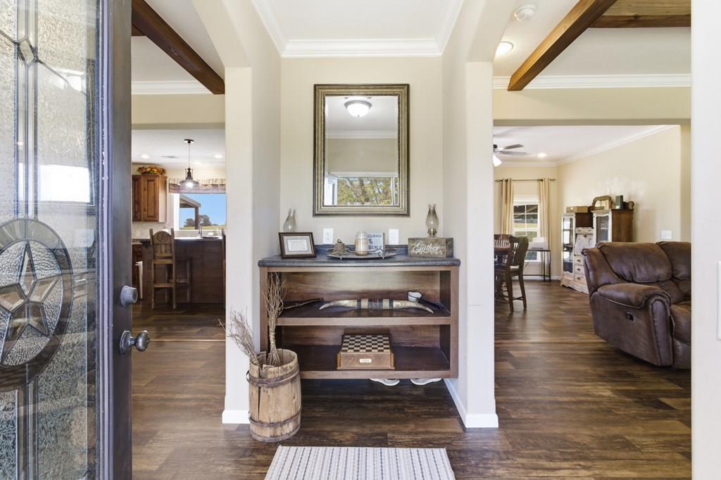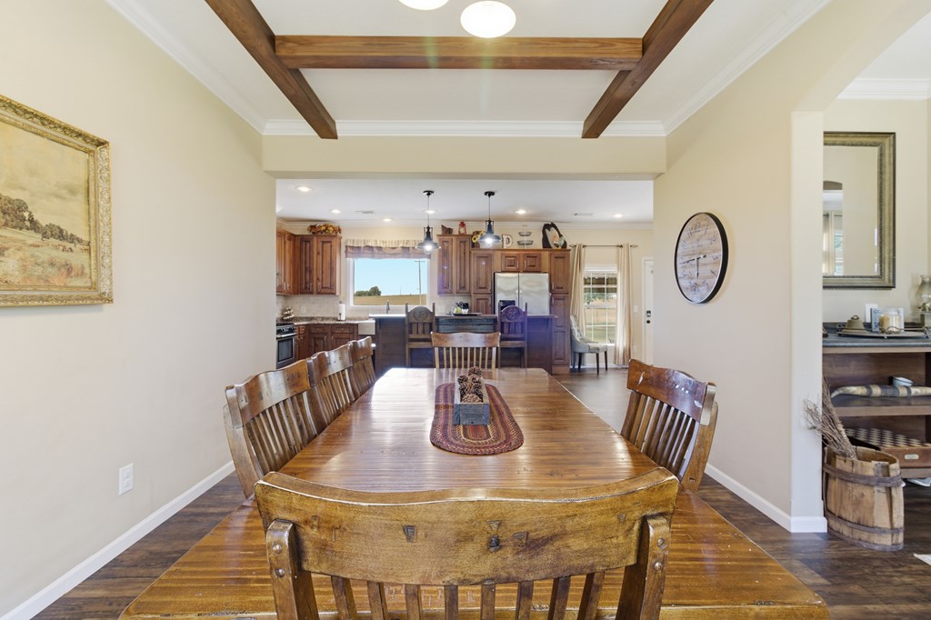 7.28 acres thoughtfully set up for self-sufficient living with room for livestock, hobbies, or business. This 4BD/2BA home offers an open layout with exposed beams, a wood-burning fireplace (gas hookup), and oversized windows with transoms throughout. The kitchen features a large island with seating, stainless appliances, pot filler, and a view overlooking the pastures. A spacious primary suite offers a large walk-in closet and a spa-like bath with jetted tub, oversized walk-in shower, and dual vanities. Layout also includes a foyer entry, formal dining, a versatile flex space, and a utility room with sink and storage. French doors open to a back deck overlooking a fully fenced yard with electric gate, cross-fenced pastures, chicken coop, multiple shops—including a spray-foamed shop with power & water currently set up for dog grooming with income potential—plus covered livestock stalls. Highway frontage with easy access while still feeling tucked away.