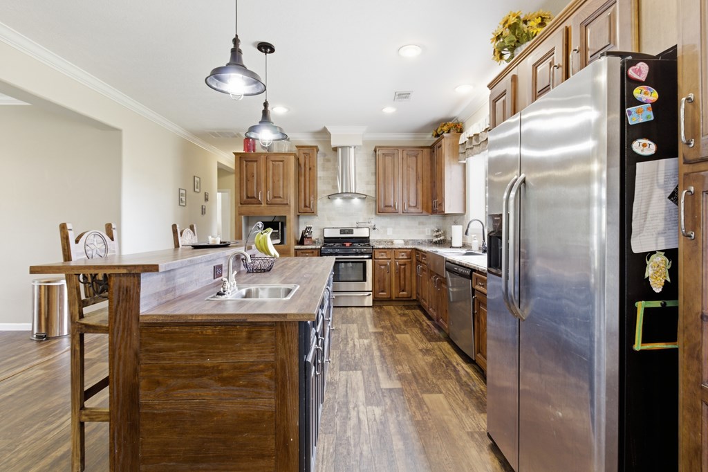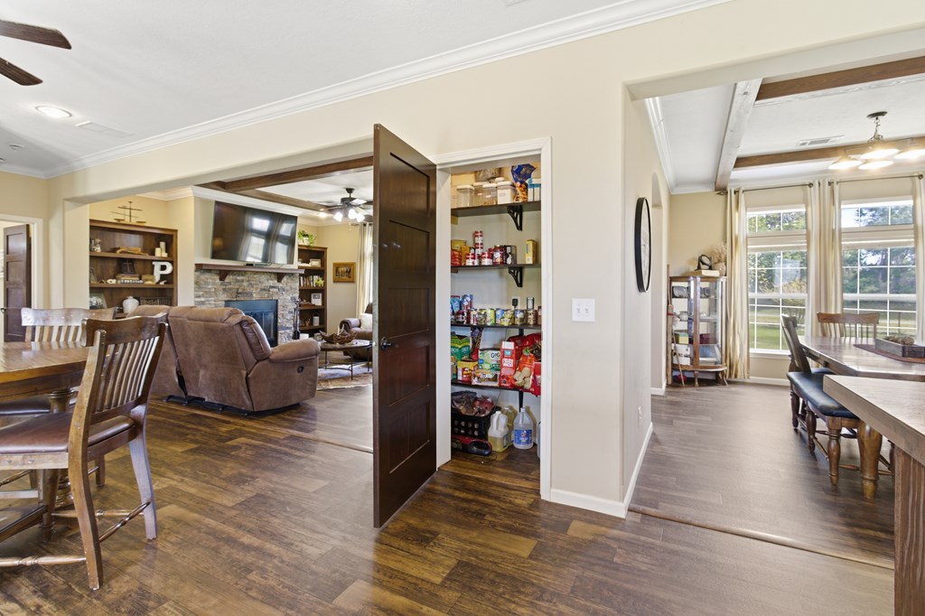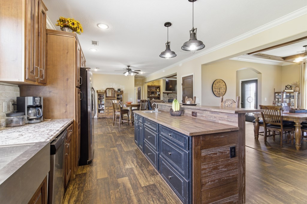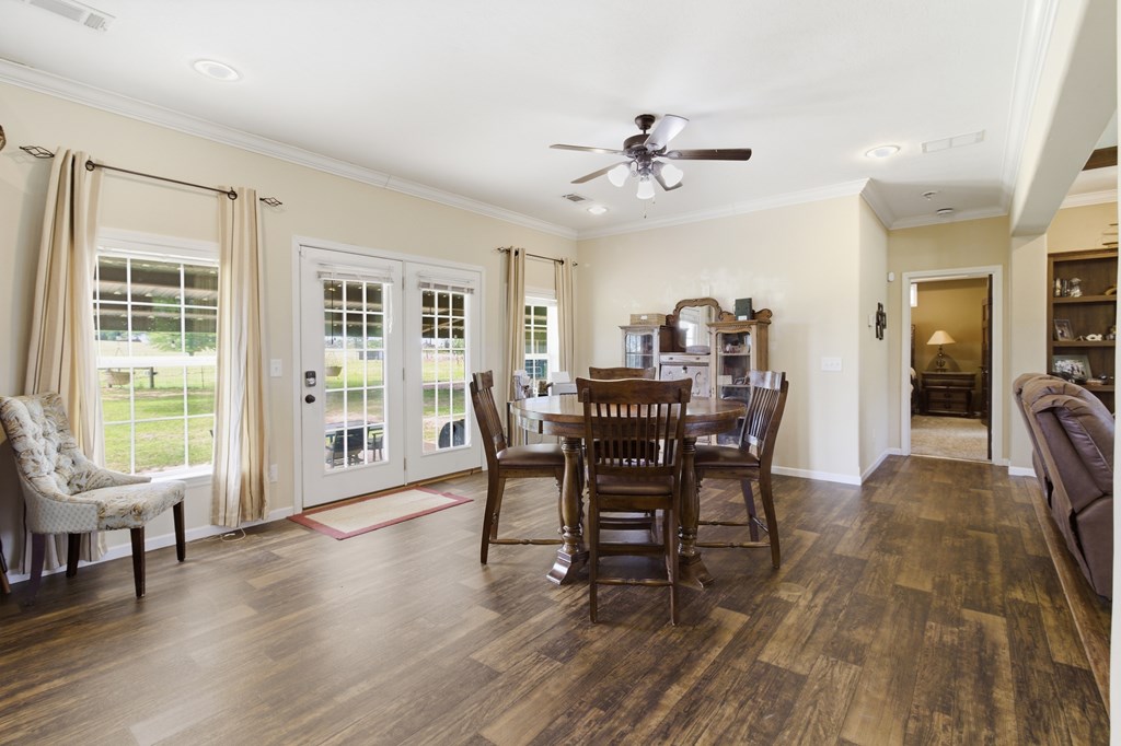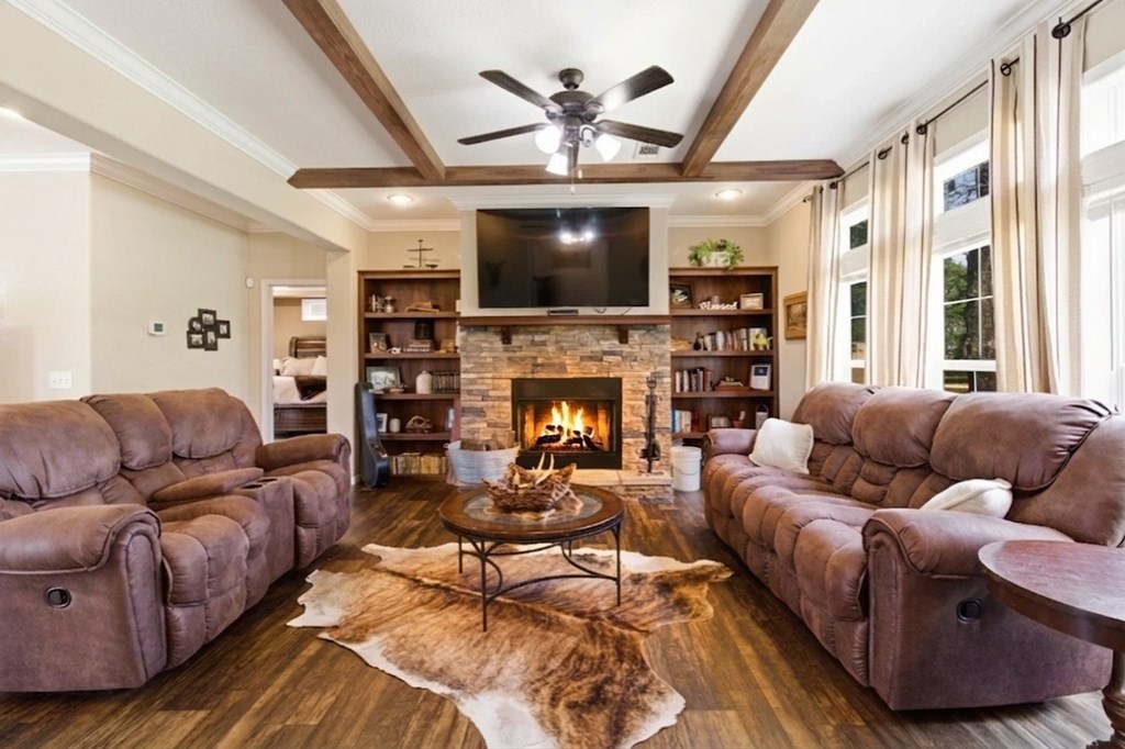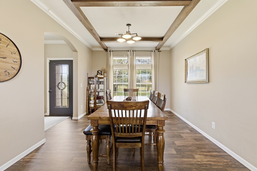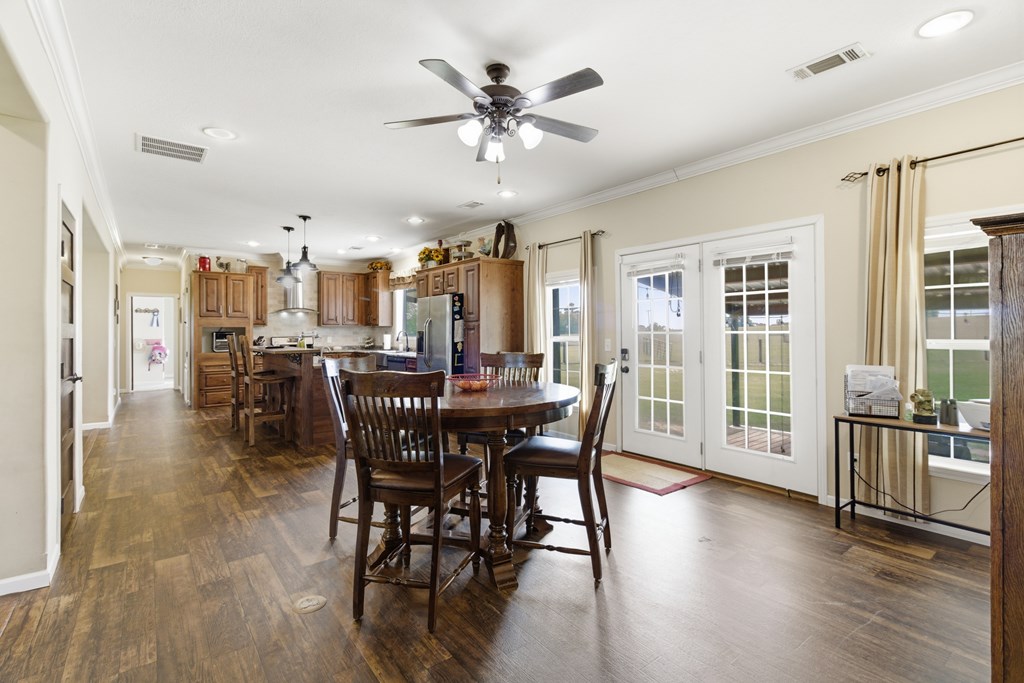 7.28 acres thoughtfully set up for self-sufficient living with room for livestock, hobbies, or business. This 4BD/2BA home offers an open layout with exposed beams, a wood-burning fireplace (gas hookup), and oversized windows with transoms throughout. The kitchen features a large island with seating, stainless appliances, pot filler, and a view overlooking the pastures. A spacious primary suite offers a large walk-in closet and a spa-like bath with jetted tub, oversized walk-in shower, and dual vanities. Layout also includes a foyer entry, formal dining, a versatile flex space, and a utility room with sink and storage. French doors open to a back deck overlooking a fully fenced yard with electric gate, cross-fenced pastures, chicken coop, multiple shops—including a spray-foamed shop with power & water currently set up for dog grooming with income potential—plus covered livestock stalls. Highway frontage with easy access while still feeling tucked away.